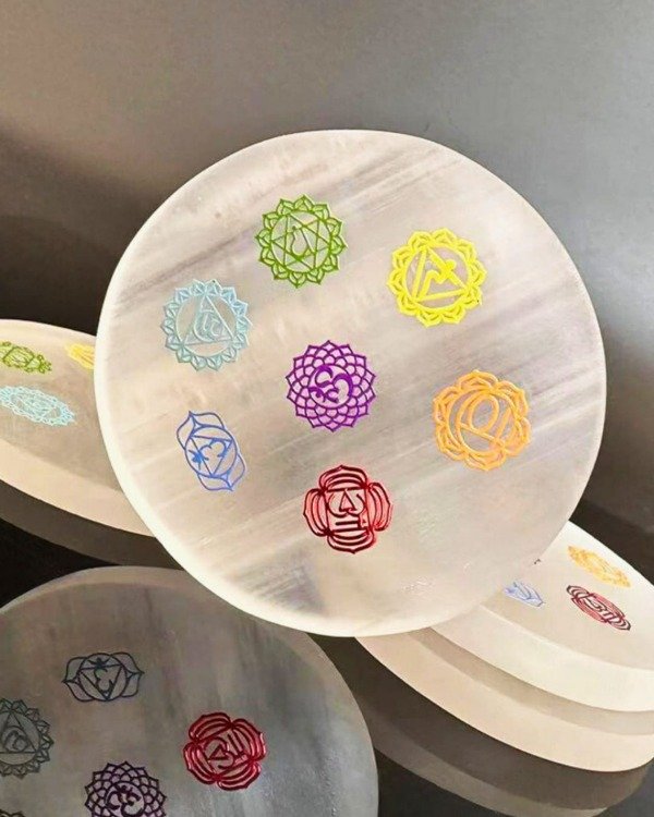 PLACA DE SELENITA CIRCULAR CON SIMBOLOGÍA GRABADA: 7 CHAKRAS