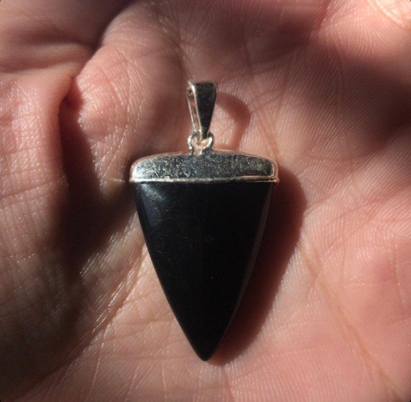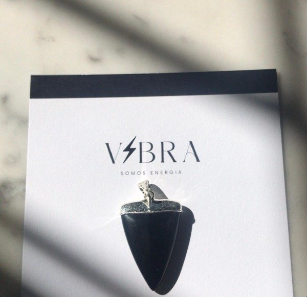 Dije de piedra natural en obsidiana negra con baño de plata. Medidas: 2,8 cm de alto x 2 cm de ancho.