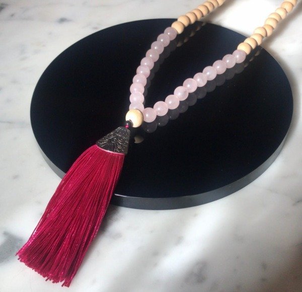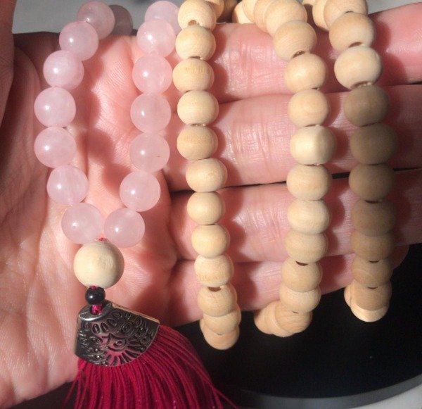 Japa Mala confeccionado en madera y piedras naturales de Cuarzo Rosa de 8 mm. Cantidad de cuentas: 108.