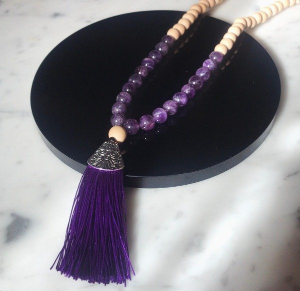 Japa Mala confeccionado en madera y piedras naturales de Amatista de 8 mm. Cantidad de cuentas: 108.