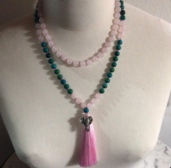 Japa Mala de 108 cuentas confeccionado en piedras totalmente naturales importadas de 8 mm e hilo resistente. En esta presentación: Cuarzo rosa y Azurita. Terminación con flecos de seda y dije de fundición Ganesha.