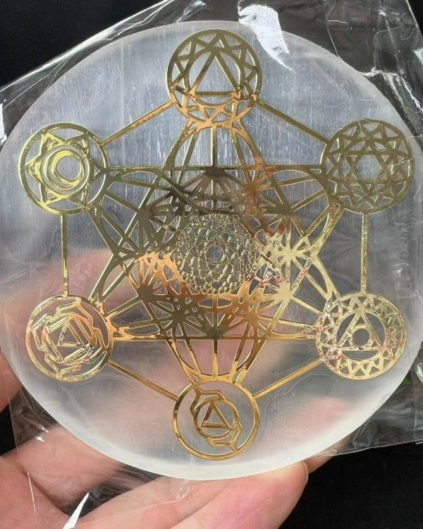 PLACA DE SELENITA CIRCULAR CON SIMBOLOGÍA GRABADA: EL CUBO DE METATRON