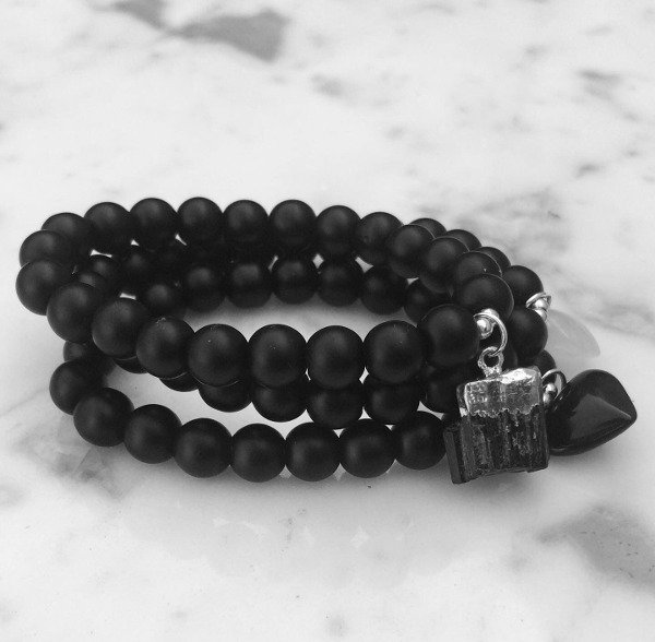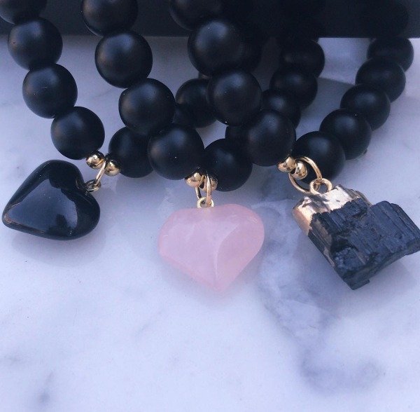 Pulseras elásticas de obsidiana negra, dijes y oro laminado. Cuentas de 8 mm.