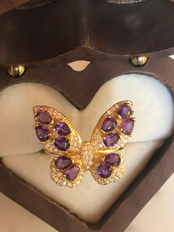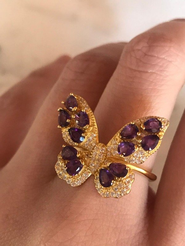 Confeccionado en Plata 925 con piedras facetada en Amatista 100% natural. Color dorado.
