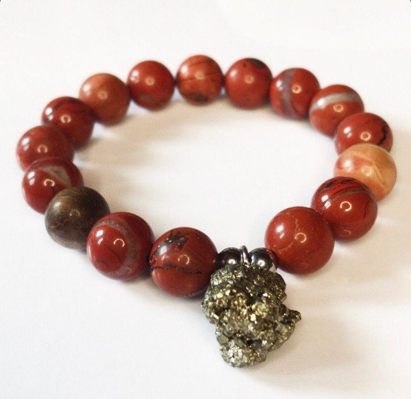 Pulsera confeccionada en piedras naturales de Jaspe Rojo de 10 mm + dije mediano de pirita. Es elástica y tiene detalles en acero quirúrgico.