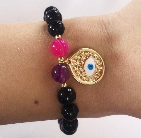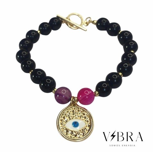 Pulsera de piedras naturales de 8 mm de Obsidiana Negra y Ágatas de Colores. Con detalles y Dije de Oro Laminado.
