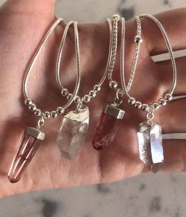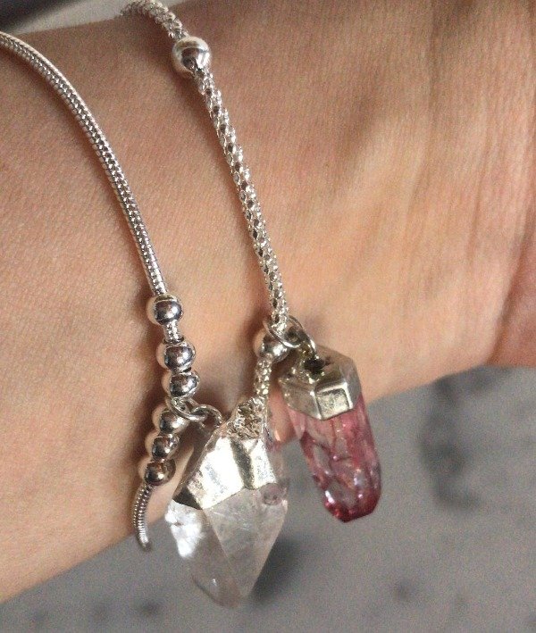 Pulsera de acero blanco y dijes de plata: cuarzo cristal o cuarzo estallado rosa.