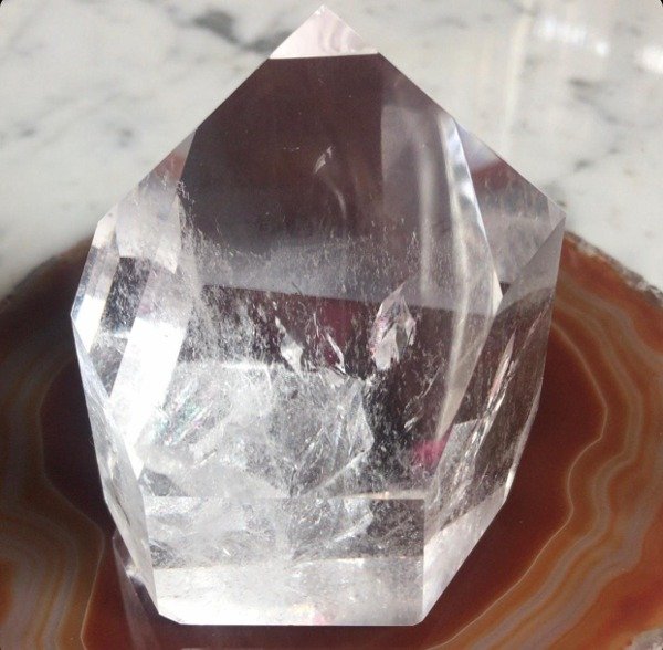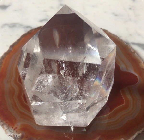 Increíble Punta Maestra de Cuarzo Cristal con pulido a mano en cada una de sus aristas lo que le da una terminación impecable. Contiene arcoíris en su interior. Medidas: 9,7 cm de alto x 6,5 cm de base. Peso: 442 gr.