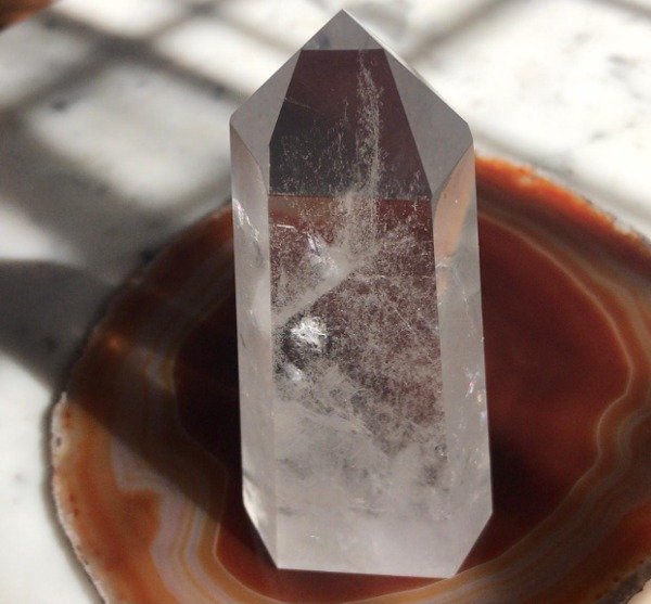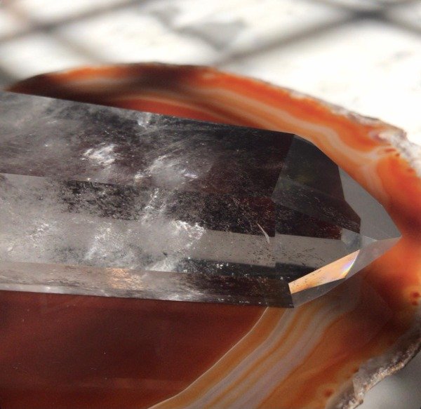 Punta Maestra de Cuarzo Cristal con pulido a mano en cada una de sus aristas lo que le da una terminación impecable y arcoíris en su interior. Medidas: 11,7 cm de alto x 5 cm de base. Peso: 260 gr.