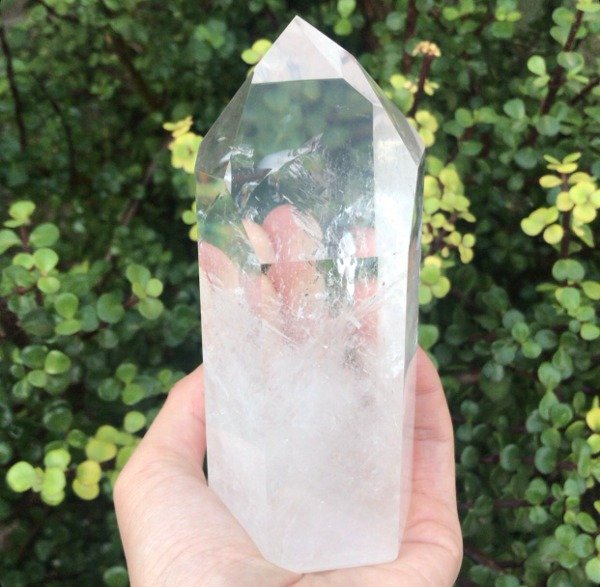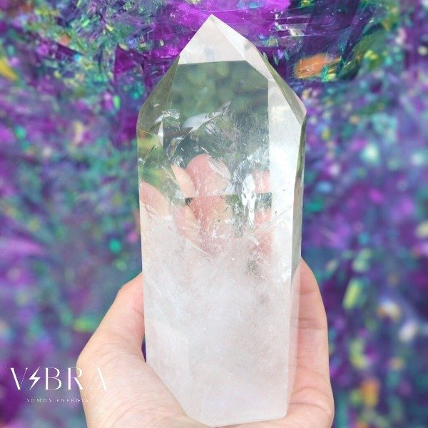 Pieza maestra de Cuarzo Cristal totalmente pulida a mano con una terminación impecable. Calidad extra premium cristalina y pura en su interior. 100% cristal. Medidas: 14,5 cm de alto x 6 cm de base. Peso: 618 gr.