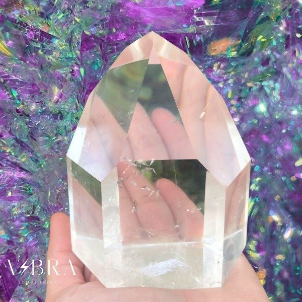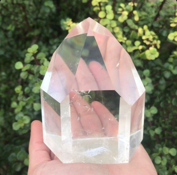 Pieza maestra de Cuarzo Cristal totalmente pulida a mano con una terminación impecable. Calidad extra premium cristalina y pura en su interior. 100% cristal. Medidas: 11 cm de alto x 8 cm de base. Peso: 699 gr.