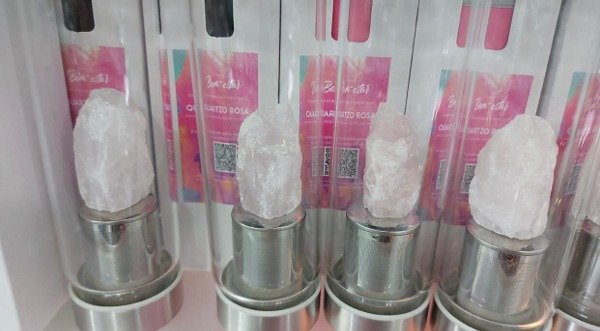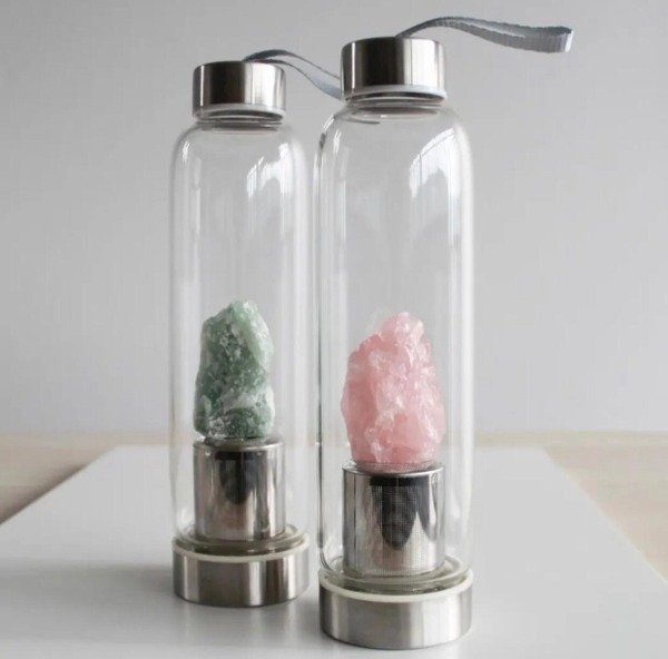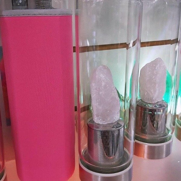 De una manera elegante y moderna combinando las energías de la naturaleza y las características holísticas para tu rutina. Todo en cristal y acero inoxidable, puedes usarlo solo con agua o añadirle té, tiene un infusor con micro agujeros. La piedra es natural y su tamaño varía entre los 3 a 7 cm de altura. Tienen 550 ml.