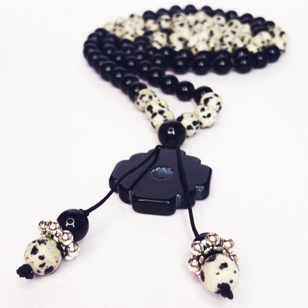 Japa Mala de 108 cuentas de piedras naturales de obsidiana negra y jaspe dalmata de 8 mm. Confeccionado en hilo resistente y una terminación con dije chakana o cruz del sur de obsidiana negra.