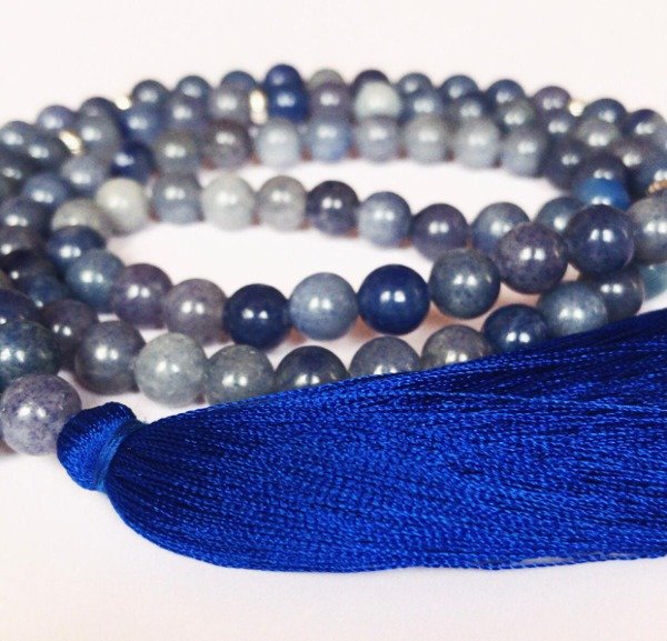 Confeccionado en piedras totalmente naturales de cuarzo azul. Con separadores de fundición y terminación en flecos de seda color azul eléctrico. Contiene 108 cuentas de 8 mm.