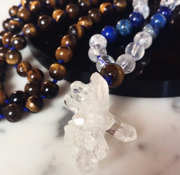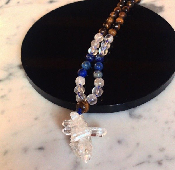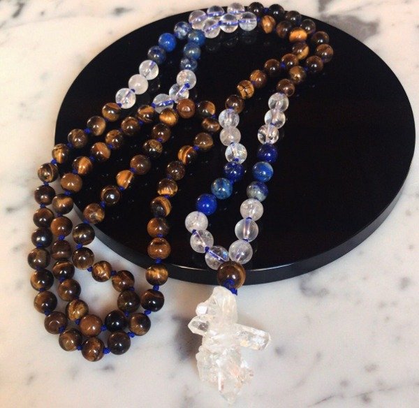 Japa Mala de 108 cuentas confeccionado en piedras totalmente naturales importadas de 8 mm e hilo resistente. En esta presentación de Ojo de tigre, Lapislázuli y Cuarzo cristal con una terminación de drusa de Cuarzo cristal.