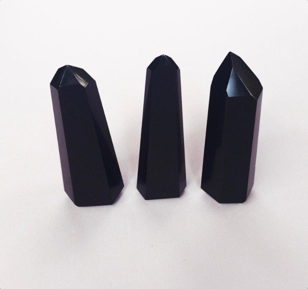 Kit de 3 piezas de obeliscos de obsidiana negra pulidos a mano cada una de sus aristas. Calidad extra premium totalmente espejadas. Origen México. Medidas: de 5,7 cm a 6 cm de alto.