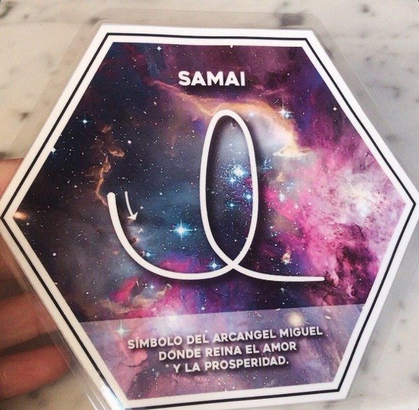 Símbolo SAMAI del Arcángel Miguel donde reina el amor y la prosperidad utilizado en Tameana. Medida: 13 x 15 cm. Impreso en papel adhesivo de alta resolución y plastificado.